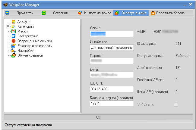 1. Для начала открываем Manager Waspace, ставим переключатель в положение "Управление аккаунтом", далее вводим там свои данные, которые указали при регистрации (логин, пароль).